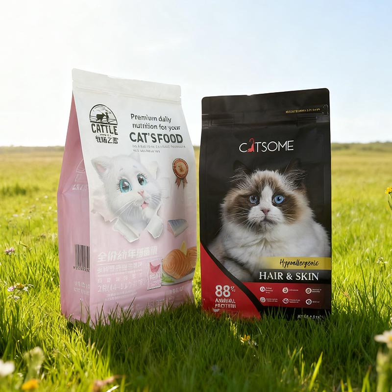 ຖົງບັນຈຸອາຫານແມວທີ່ປຸງແຕ່ງດ້ວຍອາຍຂອງ Jinde ແມ່ນເຮັດດ້ວຍວັດສະດຸທີ່ມີຄຸນນະພາບສູງຫຼາຍຊັ້ນ. ຊັ້ນນອກ ແມ່ນຮູບເງົາ PET, ເຊິ່ງເຮັດໃຫ້ຮູບແບບການພິມມີຄວາມດຶງດູດແລະຈັບຕາ; ຊັ້ນກາງແມ່ນ nylon (PA) ຫຼື ແຜ່ນອາລູມິນຽມ (AL), ເຊິ່ງເຮັດໃຫ້ອອກຊິເຈນແລະຄວາມຊຸ່ມຊື່ນ, ປ້ອງກັນບໍ່ໃຫ້ອາຫານແມວຈາກການປຽກແລະສູນເສຍ ສານອາຫານ; ຊັ້ນໃນທີ່ສຸດແມ່ນວັດສະດຸ PE, ເຊິ່ງງ່າຍຕໍ່ການປະທັບຕາແລະຮັບປະກັນການຫຸ້ມຫໍ່ແຫນ້ນ, ປ້ອງກັນບໍ່ໃຫ້ອາຫານ cat ຈາກການທໍາລາຍໄດ້ງ່າຍ.